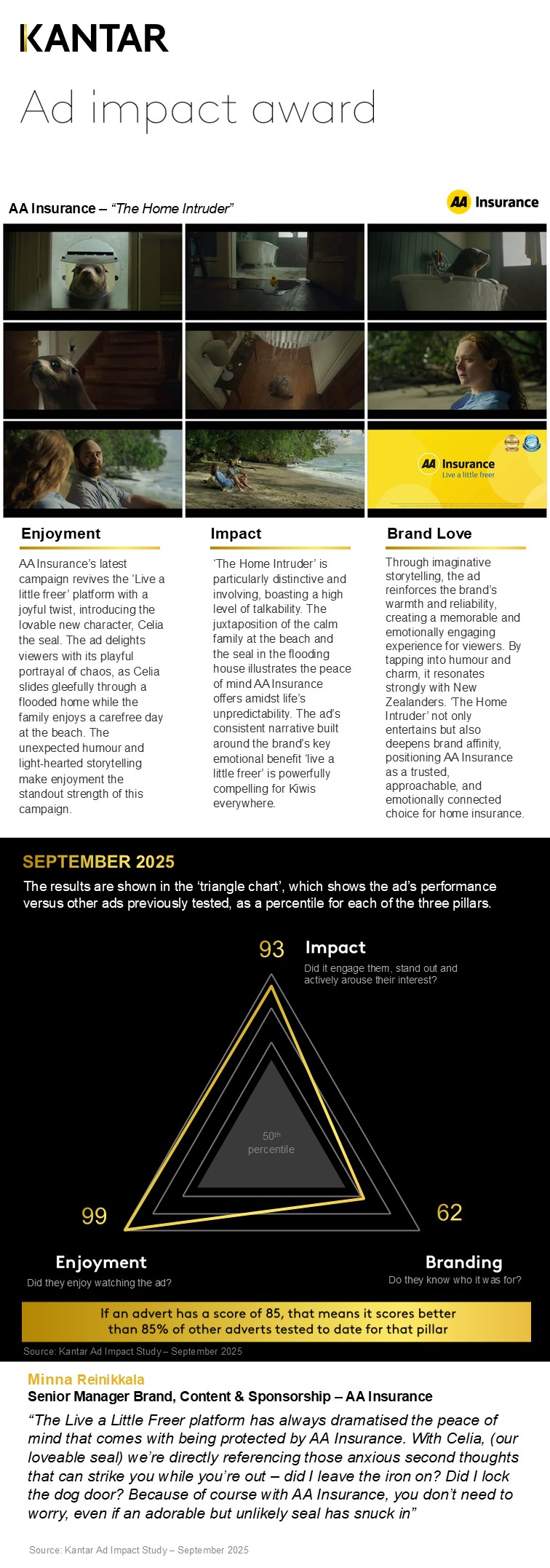Kantar’s September Ad Impact Award goes to AA Insurance. ‘The Home Intruder’ stands out for its enjoyable surreal visual storytelling, rather than portraying destruction in a conventional way, the brand introduces a CGI seal to cause chaos. The ad delivers on 3 key pillars: